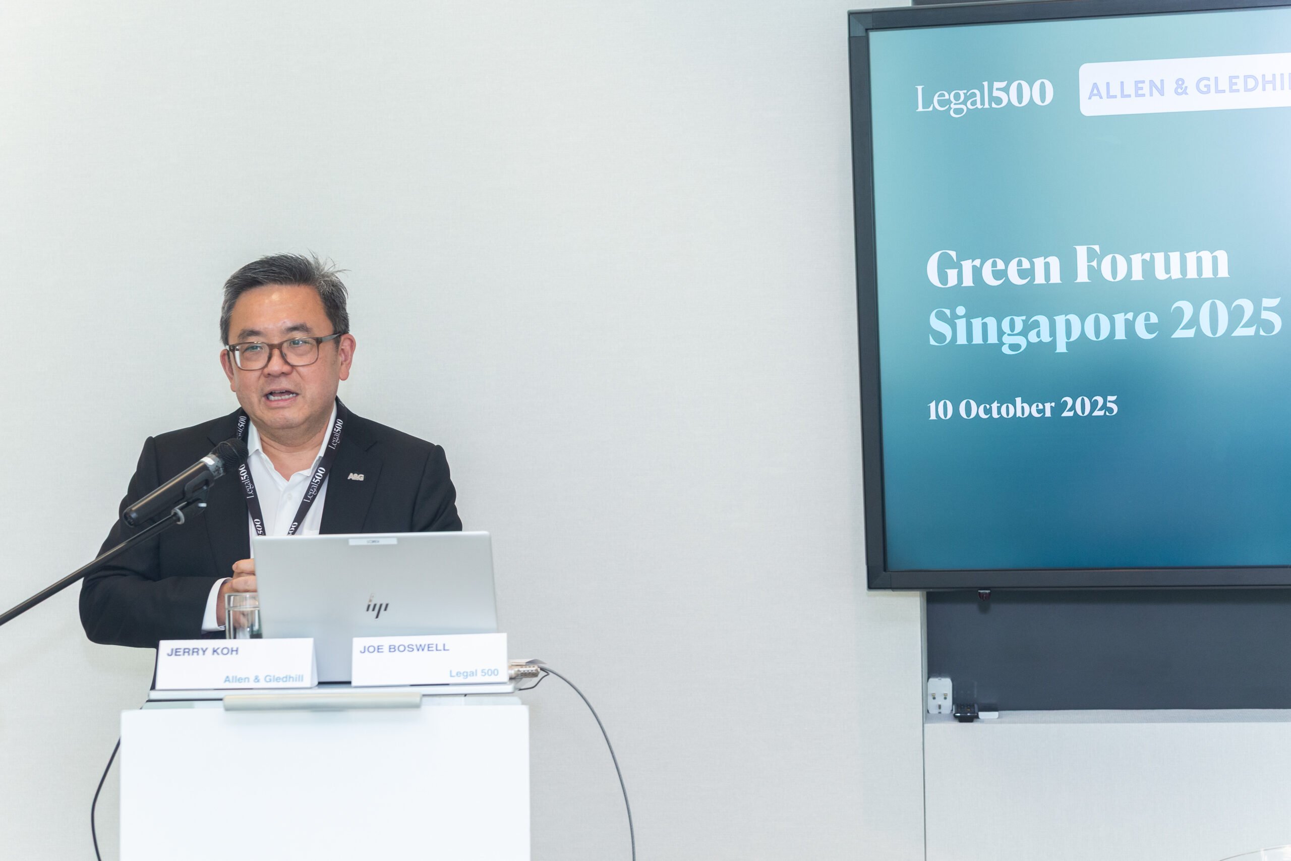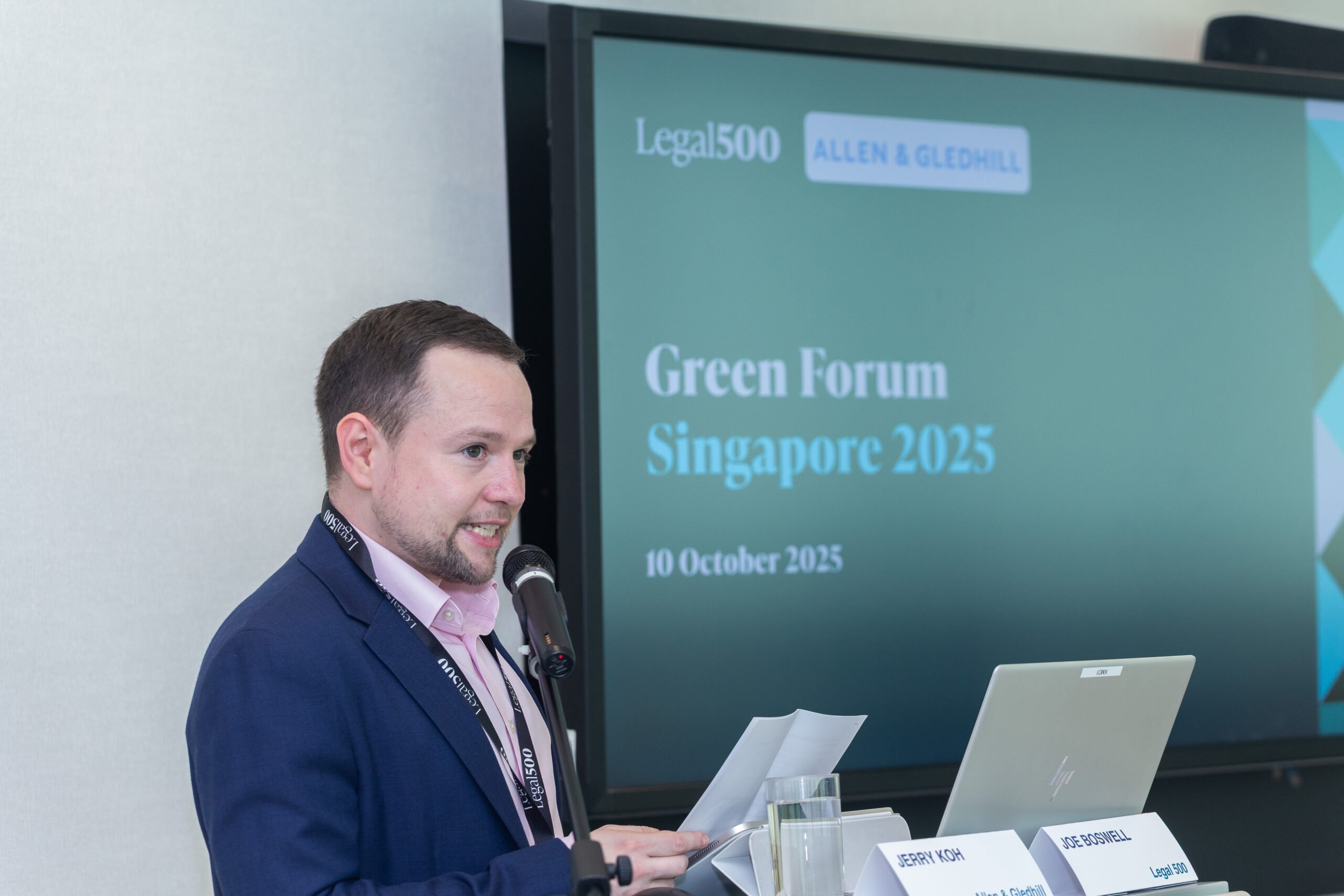 Opening remarks were delivered by Joe Boswell, Global Editor of The Legal 500’s GC Powerlist series, who highlighted the increasingly strategic role of in-house counsel in guiding organisations through the sustainability transition. He was followed by Jerry Koh, Managing Partner at Allen & Gledhill, who reflected on Singapore’s leadership in driving ESG progress across Southeast Asia and the importance of collaboration between the legal profession and industry in delivering meaningful change. He also spoke about the firm’s long-term commitment to sustainability. This extends to personal exertions by himself and the other staff at A&G, who recently engaged in rubbish-cleaning efforts in Singapore’s waterways.