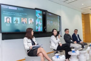 The first panel, The Impact of Technology and AI on ESG: Considerations and Challenges, examined how rapid technological advancements are reshaping sustainability priorities. Moderated by Tham Kok Leong, Head of Technology & Corporate Intellectual Property Practice at Allen & Gledhill, the session featured Sophie Lim, Co-Head of ESG & Public Policy Practice at Allen & Gledhill; Doris Chen, Head of Legal, APAC at dsm-firmenich; and Richard Koh, Chief Technology Officer, Microsoft Asia, Enterprise Partner Solutions. Together they discussed the ethical and regulatory implications of AI adoption, the importance of governance and transparency, and how legal teams can leverage technology to drive sustainable value creation.