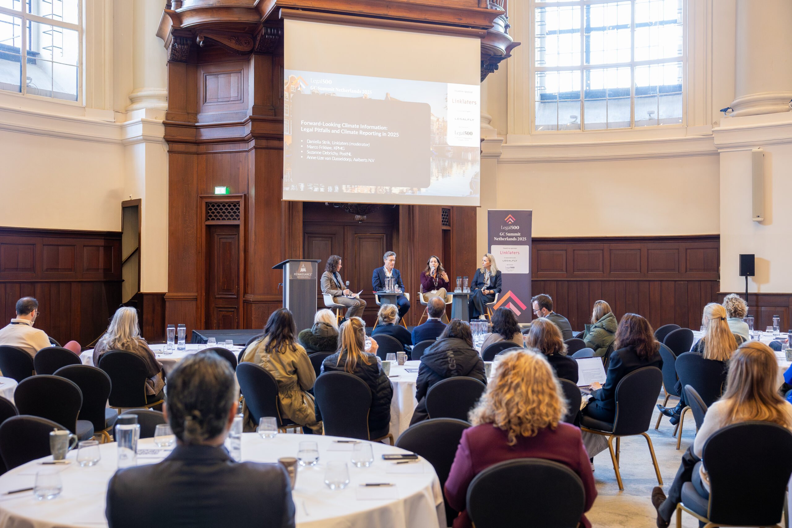 After a networking break, the summit moved to sustainability and reporting obligations in the session on legal pitfalls and climate reporting in 2025. Moderated by Daniella Strik, partner at Linklaters, the panel brought together Marco Frikkee of KPMG, Suzanne Debrichy of PostNL, and Anne-Lize van Dusseldorp of Aalberts N.V. The speakers discussed the legal risks associated with forward-looking climate statements, the challenges of preparing 2025 annual reports, and the practical decisions general counsel must navigate as climate-related disclosures expand.