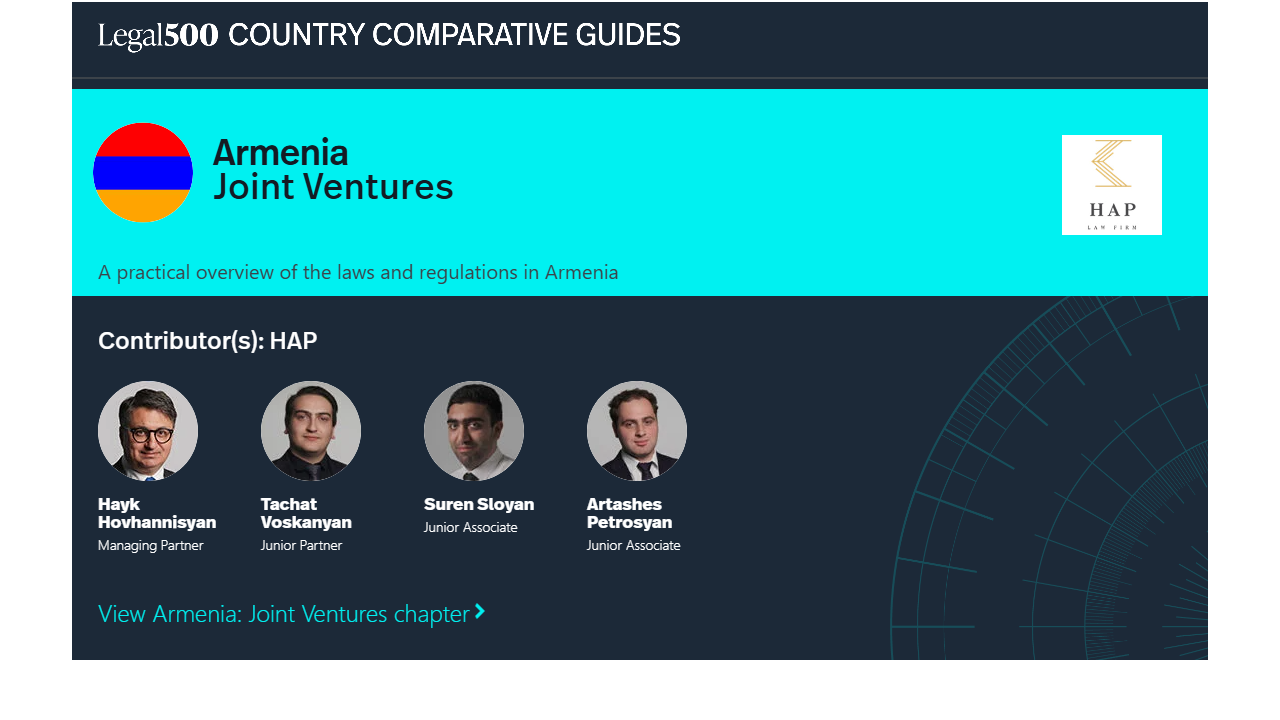 In addition, a draft Law on Investments is currently under consideration in Armenia. Its future adoption is expected to be accompanied by the issuance of various implementation regulations and secondary legislation. Considering the prospective adoption of these subordinate acts, material changes to the investment and JV framework may occur in the coming year.