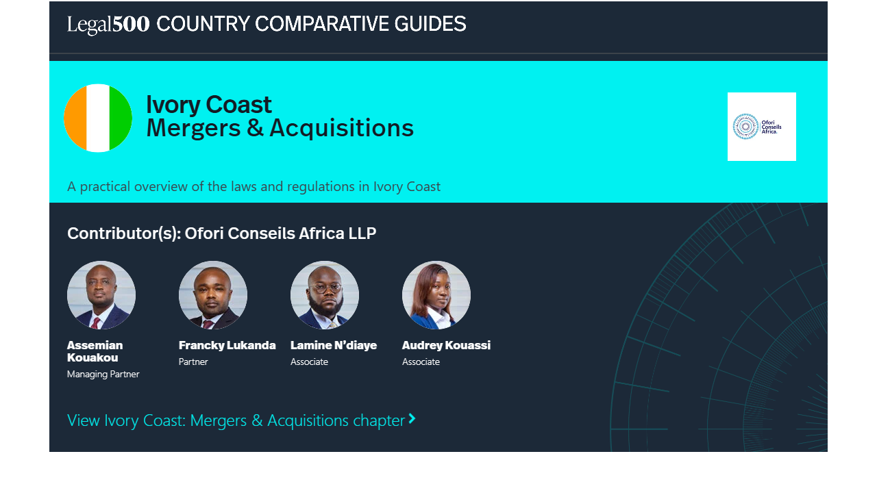Mergers and acquisitions (hereafter M&A) in Côte d’Ivoire are primarily governed by the OHADA Uniform Act on Commercial Companies and Economic Interest Groups (AUSCGIE), which provides the core legal framework for corporate reorganizations, including mergers, demergers, spin-offs, share transfers, and asset contributions. This harmonized regime regulates corporate approvals, minority shareholder protection, creditor rights, and registration formalities with the Commercial Court and the Trade and Personal Property Credit Register (RCCM), ensuring legal validity and enforceability of transactions.