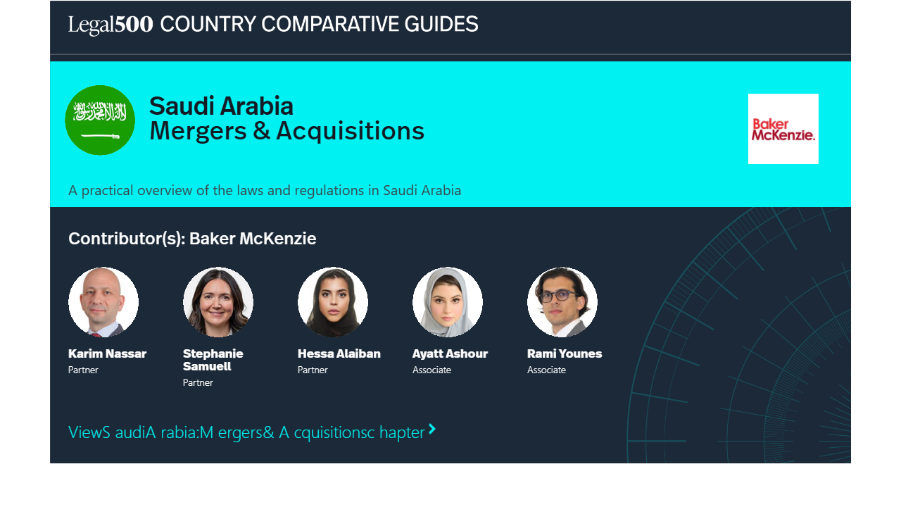 The Kingdom of Saudi Arabia’s (the “Kingdom”) M&A environment is governed by a combination of corporate, market, competition, and foreign investment regulations. The Capital Markets Authority (“CMA”) (relevant only to public M&A transactions), General Authority for Competition (“GAC”), Ministry of Investment Saudi Arabia (“MISA”) and the Ministry of Commerce (“MOC”) are the principal regulatory bodies noting always that additional sector-specific regulators may be involved depending on the industry or sector (for example, healthcare, financial services, education etc).